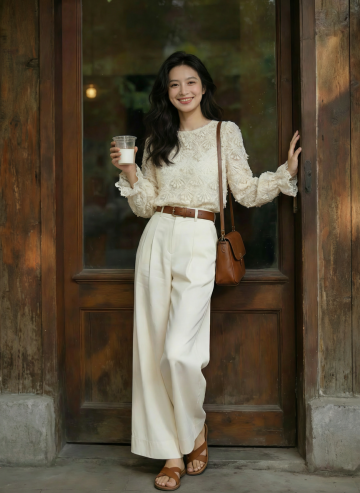 高清晰度商业人像摄影,柔和明亮的光线,细腻自然的肤色质感,棕色长卷发自然垂落,部分发丝轻盈飘动,身着浅米色简约吊带,佩戴金色细圈耳环和金色细手镯,半身构图,女性侧身站立,一手轻抚颈部,另一手自然下垂,眼神温柔望向镜头,背景为纯白色,整体呈现清新、优雅、纯净的氛围,画面简洁干净,突出人物主体。