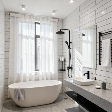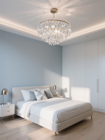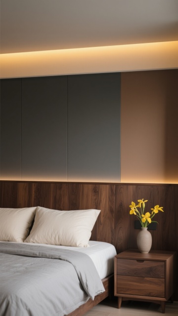 3D渲染的现代简约风格卧室,低饱和度墨绿色与暖灰色为主色调,柔和漫射自然光从右侧大面积落地窗洒入,木质地板温润有光泽,带有细微纹理。画面以床为视觉中心,床头采用浅灰色软包设计与深绿色墙面形成对比,床头两侧是黑色金属支架的玻璃台面床头柜,各放置一盏造型简约的白色球形台灯。床上铺着深绿色与灰色条纹的床单,搭配几个不同材质的灰色抱枕和一条米色针织毯随意搭在床尾。床尾正对着一面悬挂着抽象几何线条装饰画的墙,画框为黑色细边框。左侧墙面嵌入一整面墙的深灰色推拉门衣柜,衣柜底部设计有开放式展示格,摆放着几本精装书和一个小型绿植盆栽。右侧窗边设有一个浅灰色布艺单人沙发,沙发旁是一个原木色小圆几,上面放着一个白色陶瓷花瓶,里面插着几支干花。地面铺着一块浅灰色短绒地毯,地毯上随意散落着一本翻开的杂志和一个编织篮。整个空间光影层次丰富,阴影柔和,营造出宁静舒适且极具现代设计感的休憩氛围,视觉层级清晰,信息传达简洁高效,符合现代都市年轻人群的审美需求。
