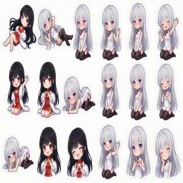 一系列六个不同造型的同元素动漫风格少女角色集合,规整排布在纯色背景上,保持原有的日式动漫线稿风格,柔和的灰色调背景,少女们穿着白色连帽外套、棕色短裙和长靴,展现出六种完全不同的动态姿势,包括站立、跳跃、挥手、坐姿等,每个角色都有双马尾发型,面部表情生动,线条流畅自然,整体构图平衡有序,呈现出统一的动漫角色设计感和动态表现力。