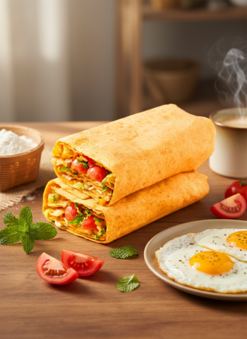 高清写实风格,明亮自然光,和煦阳光从画面左上方照射,形成清晰的投影和柔和的高光。一个由干草编织的圆形鸟巢,内有五个完整的鸡蛋(三颗浅棕色带深色细斑点,两颗纯白色)和两个破裂的鸡蛋(蛋壳裂开,露出橙黄色的蛋黄和透明的蛋清,蛋黄部分流出),所有鸡蛋紧密排列,破裂的鸡蛋位于鸟巢前方两侧。背景是一个温馨的木质早餐桌面,桌面上铺着一块浅蓝色格子棉质餐布,餐布边缘自然垂落,桌面上散落着几片新鲜的薄荷叶、几颗饱满的红色小番茄和一把银色的小叉子,远处背景模糊可见厨房的浅灰色瓷砖墙面和白色的陶瓷餐具。整体色调以暖黄色、浅蓝色和原木色为主,色彩和谐明快,营造出温馨、舒适的早餐氛围,光影过渡自然,鸡蛋和食物的质感细腻真实,草编鸟巢的纹理清晰可见,画面构图采用中心聚焦,四周元素均衡分布,具有清晰的视觉层次。