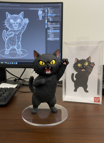 将这个图片制作成一个商业化1/7比例手办,风格写实,环境逼真。手办放置在电脑桌上,配有一个圆形透明亚克力底座,底座上没有文字。电脑屏幕上显示着手办的Zbrush建模过程。电脑屏幕旁边是一个万代风格的透明玩具盒,上面印有原始画作。
