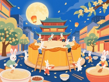 国潮风插画,拟人化兔子共制巨型月饼,扁平风格配色明快,融合剪纸元素与传统建筑,营造中秋喜庆氛围。
