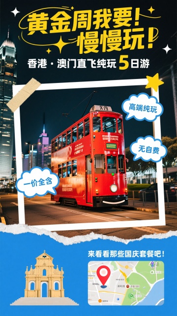城市夜景风融合地图元素,实景感与光影感交织,展现澳门都市繁华。大字风标题搭配轻拟物插画地图,现代感与时尚感兼具,传递国庆出游的奢华商务体验。