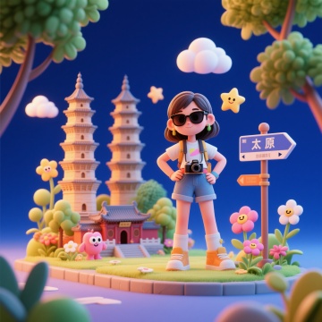 清新卡通3D风,微缩艺术展现太原美景,行李箱创意设计,尽显旅行乐趣。