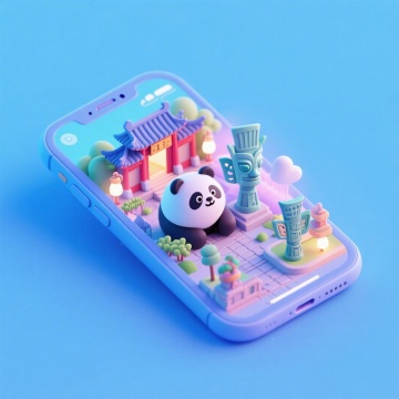 软3D风微缩艺术场景,熊猫与古风建筑萌趣互动,清新梦幻色彩搭配,营造可爱卡通氛围。