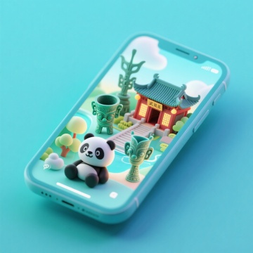 软3D风微缩艺术,熊猫与古风建筑跃出手机屏,可爱卡通造型搭配梦幻清新色调,营造立体体积感与节日氛围。