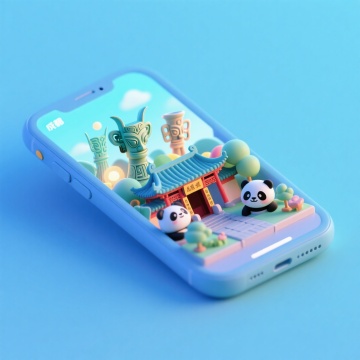 软3D风微缩艺术场景,可爱熊猫与传统建筑在手机屏上梦幻联动,融合卡通感与科技感,清新蓝调点亮节日氛围。