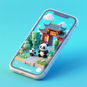 软3D风格手机微缩场景,熊猫与古蜀元素萌趣互动,清新梦幻,卡通感十足,呈现成都文化虚拟现实体验。
