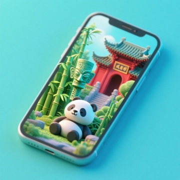 软3D风微缩艺术场景,可爱熊猫与古蜀神像跃出手机屏幕,融合卡通感与梦幻色彩,呈现清新治愈的虚拟现实体验。