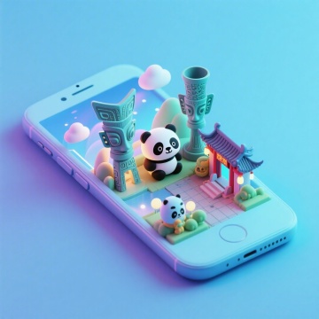 软3D风格的微缩艺术场景,熊猫与传统建筑在手机屏幕上梦幻呈现,融合科技感与卡通感,清新柔和,充满可爱气息。