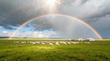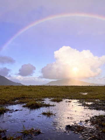 实景感与梦幻感交织,彩虹横跨青山碧野,雨丝轻洒,草叶晶莹,光影流转间尽显清新自然之美,唯美的视觉氛围中透出浪漫与希望。