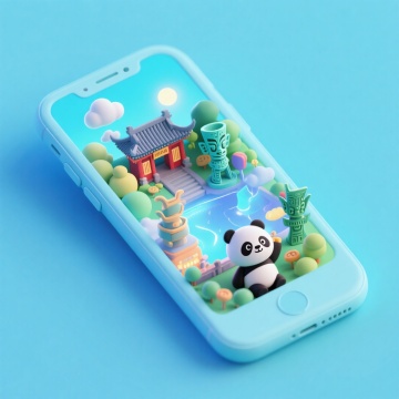 软3D风融合粘土质感,可爱熊猫与传统建筑在手机屏幕中构建梦幻微缩世界,霓虹光效点缀,科技感与文化元素交织,呈现虚拟现实般的节日奇境。