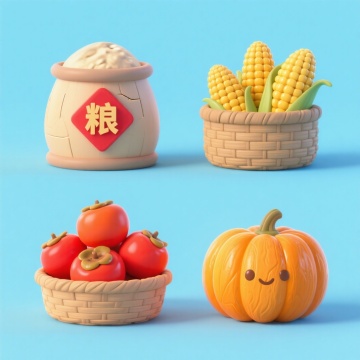软3D粘土风,可爱卡通感十足,清新色系搭配体积感设计,呈现丰收主题的秋日节日氛围。