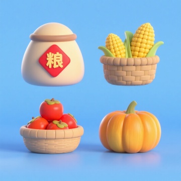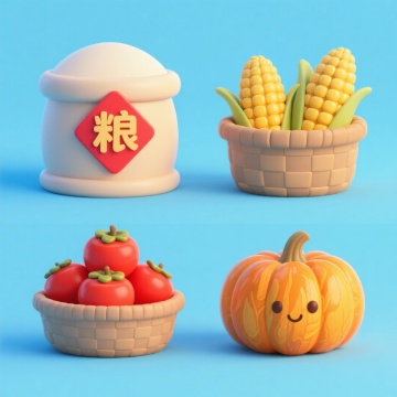 软3D粘土风,可爱卡通造型,饱满体积感,呈现丰收主题,适合中秋或秋收节日氛围。