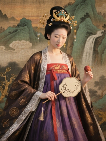 工笔风仕女图,刺绣与油画质感交融,古典中式美学尽显优雅与唯美,浮雕式发饰点缀,尽展传统节日华韵。