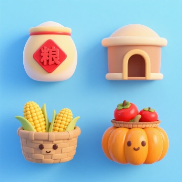 软3D粘土风,可爱卡通质感,融合丰收元素,质朴清新,展现秋日节日氛围。