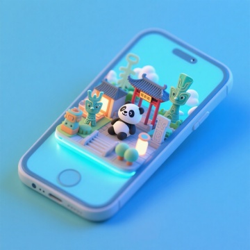 软3D风微缩艺术,熊猫与古建筑在手机屏幕中梦幻联动,霓虹灯效点缀未来感,卡通化设计融合科技与传统文化,营造虚拟现实中的可爱场景。