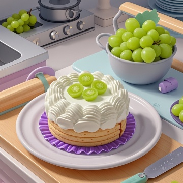 软3D风格的现代简约厨房场景,整体采用明亮的白色调为主,搭配原木色的温暖点缀,营造出清新自然且宁静舒适的氛围。画面以大理石纹理的白色厨房台面为视觉焦点,台面上放置一个浅绿色的盘子,里面装有几颗鲜红饱满的西红柿和被切开的青柠。台面右侧边缘有一个木碗,里面放着一个黄色的柠檬。背景中,白色的橱柜带有简约的木质把手,橱柜上方的墙壁上挂着一个木质挂杆,上面挂着几条浅色的毛巾和几个不同大小的木质锅铲、汤勺。灶台位于左侧,上面有一个银色的锅具,旁边的台面上摆放着装有各种香料的玻璃罐、一个木质砧板以及盛放着彩色水果的木盘。右侧窗户透进柔和的自然光,在台面和橱柜上形成清晰而柔和的光影效果,光线明亮且均匀,阴影过渡自然。整体画面构图遵循三分法,物体摆放错落有致,空间感强,细节丰富,具有柔和的3D质感和平滑的材质表现,色调和谐统一,给人一种干净整洁、温馨宜居的感觉。