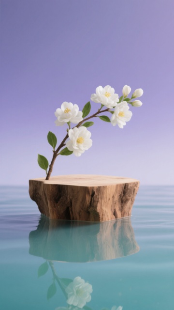 画面中央,一段自然形态的浅棕色木头展台(原漂流木形态)静静置于水面之上,其粗糙的木质纹理清晰可见,并有一个自然形成的孔洞。木头一端延伸出一枝盛开的白色花朵,花瓣纯净,花蕊呈淡黄色,搭配几片鲜绿色的叶子,花朵姿态自然舒展。背景为渐变的深靛蓝色,从上至下由深邃的夜空蓝逐渐过渡到宁静的午夜蓝,营造出静谧而神秘的氛围。水面呈现出带有光泽的暗孔雀蓝,木头和花朵在水中形成清晰而柔和的倒影,水面上有细微的波纹。整体光影为柔和的侧逆光,光源来自画面一侧,在木头边缘和花瓣上形成淡淡的金边高光,阴影部分呈现出蓝紫色调,与整体冷色系的配色和谐统一,画面整体风格保持原有的极简、自然、禅意的写实摄影风格,色彩转变为以深靛蓝、孔雀蓝、蓝紫色为主的冷色调体系。