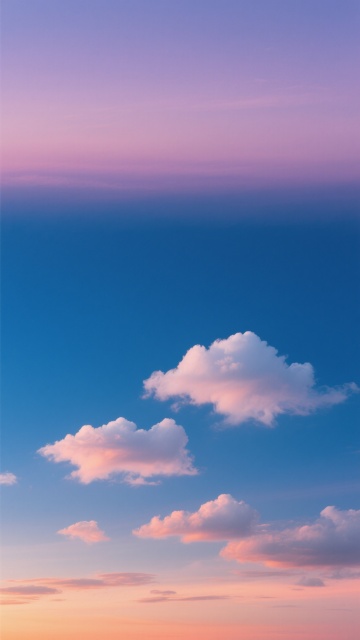 深蓝渐变的傍晚天空,深邃的蓝色由上至下逐渐过渡到天边淡淡的粉紫色霞光,几朵形态蓬松、边缘柔和的白色积云点缀其间,云层底部被夕阳染上温暖的橘粉色,整体画面呈现出宁静而悠远的氛围,光线柔和,天空清澈通透,没有明显的光源直射,只有天边残留的落日余晖温柔地照亮云层。