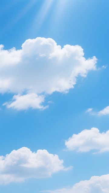 一张呈现清澈明亮蓝天背景的插画,天空由上至下呈现从纯净湛蓝到柔和浅蓝的自然渐变,画面下方分布着形态蓬松、边缘柔和的白色积云,云朵具有轻盈的半透明感和细腻的层次变化,整体氛围宁静、开阔、充满阳光感,色彩和谐统一,给人以轻松愉悦的视觉感受。