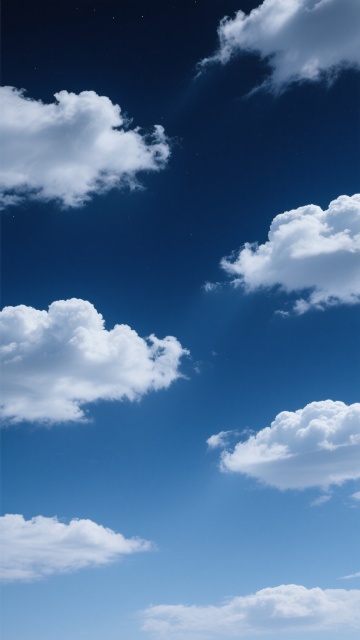 深邃夜空,深邃的靛蓝色渐变背景,点缀着疏朗分布的白色云朵,云朵形态轻盈蓬松,边缘柔和,呈现出自然的絮状纹理,整体画面干净通透,色调静谧沉稳,营造出宁静悠远的夜晚氛围,无任何文字及标识元素。