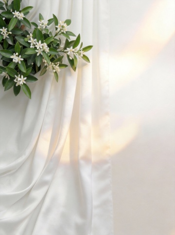 柔光穿透纱帘,白花绿叶点缀其间,轻拟物风与水彩质感交织,营造清新柔和的文艺氛围,光影流动间尽显优雅与舒适。