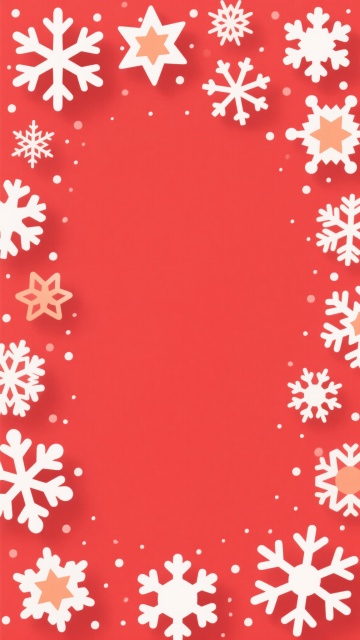 大面积留白的圣诞背景设计,以纯红色为底色,边缘装饰多种大小不一、形态各异的白色雪花图案,雪花造型包含六角星基础结构并带有精致分叉细节,部分雪花带有浅橙色渐变效果,背景中散布着细小的白色圆点模拟飘落的雪花,整体呈现简洁、节日氛围浓厚的平面设计风格,视觉层次清晰,留白区域占比大,突出空旷纯净的冬日圣诞感觉。