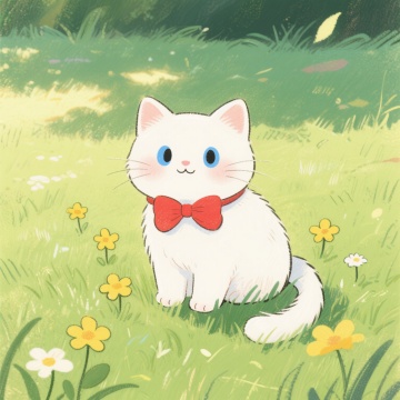 水彩风插画,白猫戴红蝴蝶结坐于花丛,拟人化设计,清新梦幻,传递春日温暖与童趣。