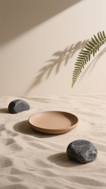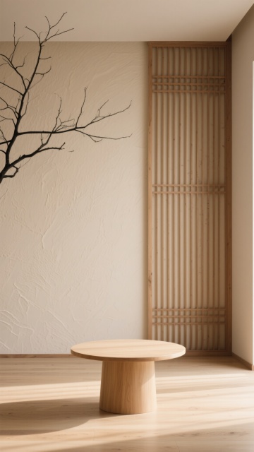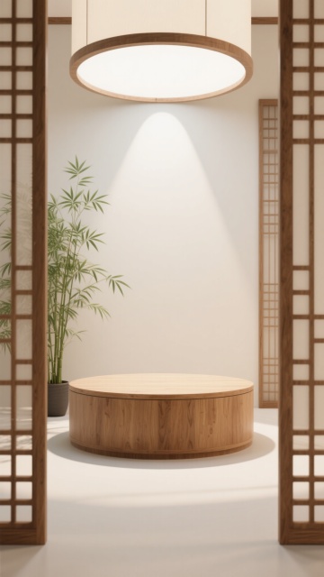 一个具有浓郁中式风格的室内场景,画面整体以米白色和原木色为主色调,营造出宁静、雅致、禅意的氛围。柔和的自然光从上方斜射下来,在背景墙上形成淡淡的光影层次,光线明亮且柔和,阴影过渡自然。画面中央偏下位置有一个圆形的原木色展台区域,展台表面光滑,边缘圆润。背景由左侧的中式木格栅、中间的圆形素色背景板和右侧的竖条木格栅组成,木格栅线条简洁规整,圆形背景板干净素雅。左侧展台旁摆放着一盆翠绿的竹子,叶片舒展,增添了生机与自然气息。整个画面构图注重留白,留空区域约占70%,形成了疏朗有致的视觉效果,展现出中式美学中“少即是多”的意境,整体风格统一、和谐,给人一种静谧、舒适、古朴而不失现代感的视觉体验。