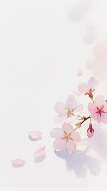 水彩风格插画,整体呈现柔和透明的晕染质感,以右下侧为视觉焦点,几朵盛开的樱花和散落的花瓣构成自然的弧形构图,花瓣边缘有细腻的水彩笔触纹理,色彩由中心向边缘自然渐变,背景为纯净的白色负空间,营造出轻盈、浪漫、清新的氛围,光影柔和,无明显阴影,仅有花瓣本身的色彩浓淡变化形成微妙层次。