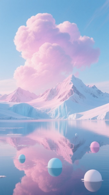 超现实主义风格自然风光插画,粉蓝渐变配色,纯净浅蓝色天空中漂浮着巨大蓬松的粉紫色云朵,阳光透过云层洒下柔和的光线,远处是覆盖着皑皑白雪的连绵冰川山脉,山体呈现出淡粉色与浅蓝色的微妙渐变,山脚下是平静如镜的湖水,湖面清晰倒映着天空的粉云与冰川的轮廓,湖水中点缀着几个圆润的浅蓝色和粉白色漂浮物,整体画面营造出极致梦幻、宁静而又浪漫的氛围,色彩和谐统一,光影柔和细腻,呈现出童话般的唯美意境。