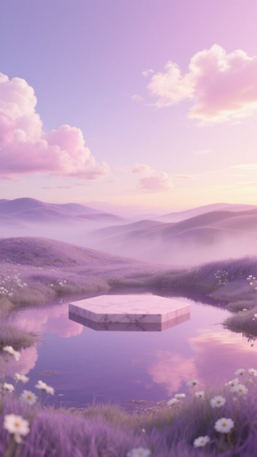 超写实风格,纯净的粉紫色渐变天空,点缀着蓬松的粉白色云朵,柔和的侧逆光洒下温暖的粉金色光芒,远处是连绵起伏的雾紫色丘陵,近处是泛着淡淡粉紫色倒影的平静水洼,水洼中央漂浮着一个六边形的浅粉色大理石平台,平台边缘光滑,表面有细腻的自然纹理,周围环绕着鲜嫩的淡紫色青草和白色小花,整体画面营造出梦幻、宁静、浪漫的氛围,构图采用低角度仰拍,突出平台的悬浮感和天空的广阔感,光影过渡自然,色彩和谐统一,细节清晰,质感细腻。