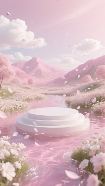 梦幻3D风,虚拟自然景观,超现实主义设计,液态花瓣环绕,营造浪漫氛围。