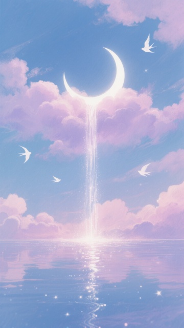 工笔风插画,水墨与水彩交融,月满中秋夜,金桂映湖心,云山缭绕,静谧唯美,尽显中式古典诗意。