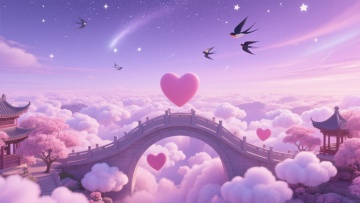 七夕主题背景图,粉紫色氛围,画面下端中心有一座古风拱桥,俯视视角,桥下有很多立体云朵,其中一两朵为爱心形状,上半部分是天空,天空中有星星和喜鹊,3D立体画风,高清摄影,8K,光影效果,写实感