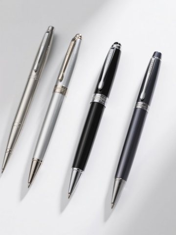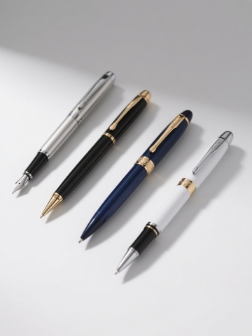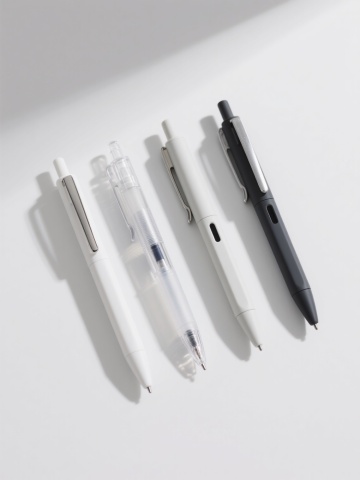 高清晰商业产品摄影风格,4支不同样式、不同风格、不同配色的笔,排列整齐,白色背景,每支笔具有清晰的材质细节,包括可能的金属笔夹、透明笔杆、磨砂或光滑的塑料表面,精准的光影效果,柔和的顶部光源,轻微的投影增加立体感,专业的产品展示构图,物体边缘锐利,色彩真实自然,无LOGO、无文字、无二维码及联系方式。