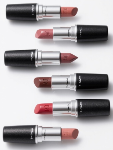 6款完全不同造型的MAC口红产品集合,包含黑色磨砂外壳、银色金属圈与品牌标识的口红管身,以及不同色号的膏体,每个口红造型各异(如斜切面、圆顶、方头、尖头、心形、棱角形等),采用纯白色纯色背景,保持高清晰产品摄影风格,精确的光影控制,柔和的顶部光源,细腻的金属质感表现,磨砂表面的细微颗粒感,规整的网格状排布,每个口红之间保持均匀间距,整体构图平衡对称,无任何文字、LOGO、二维码及多余装饰元素,专业美妆产品海报级展示效果。