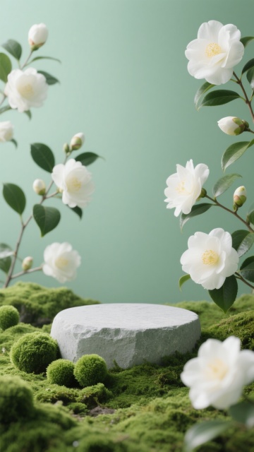 一张具有高设计感的自然主题海报,画面中央偏下位置有一块浅灰色的圆形石台,石台表面有自然的纹理和细微的凹凸感。石台周围及前景覆盖着茂密的鲜绿色苔藓,苔藓呈现出蓬松、柔软的质感,其间点缀着几簇小型的绿色球状植物。石台后方及四周分布着多枝盛开的白色山茶花,花瓣洁白无瑕,边缘略带自然卷曲,花蕊呈淡黄色,部分山茶花处于含苞待放的状态,花茎细长,带有深绿色的椭圆形叶片,叶片脉络清晰,边缘光滑。背景是纯净的浅绿色,色调柔和均匀,营造出宁静、清新、自然的氛围。整体构图采用对称与平衡的布局,山茶花主要分布在画面的左下、右下及右上位置,形成自然的边框感,石台作为视觉焦点位于中心,苔藓和前景的山茶花枝叶形成丰富的前景层次,画面整体光线柔和,为漫射光效果,阴影细腻,色彩和谐统一,以绿色和白色为主色调,传递出自然、纯净、生机盎然的感觉,信息传达简洁明了,视觉层级清晰,主体突出,符合追求自然、简约、清新风格的受众审美。