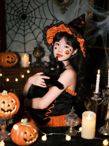 复古哥特风与可爱动漫元素融合,少女怀抱黑猫,南瓜灯与蛛网营造神秘梦幻的万圣节氛围,温暖灯光点缀温馨趣味感。