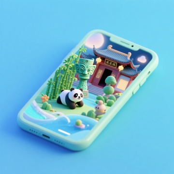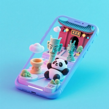 软3D风格的微缩艺术场景,熊猫与中式建筑、青铜器共现手机屏幕,融合可爱感与卡通感,展现东方美学与现代科技的趣味碰撞。