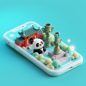 软3D风微缩艺术场景,可爱熊猫与古蜀神像跃出手机屏幕,融合卡通感与梦幻色彩,呈现清新治愈的虚拟现实体验。