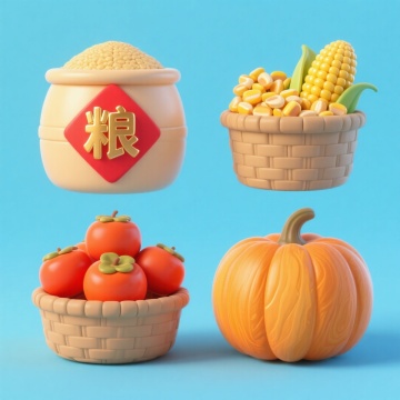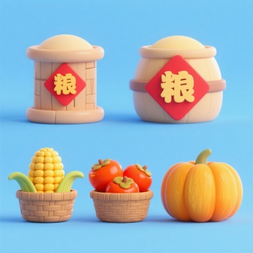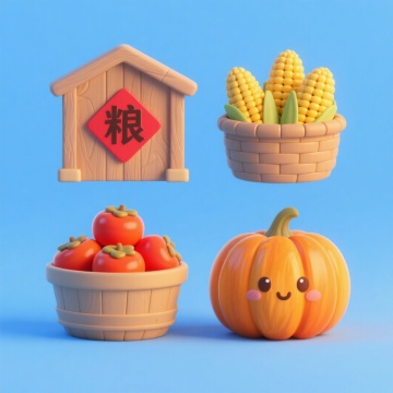 软3D风结合轻拟物设计,呈现可爱卡通感的丰收元素,粮仓、玉米、柿子与南瓜造型饱满生动,色彩明快,节日氛围浓厚。