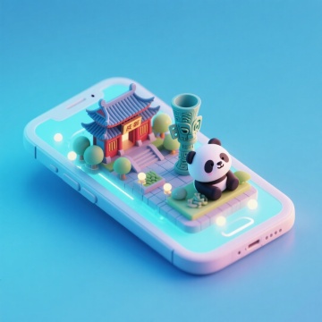 软3D风微缩艺术场景,可爱熊猫与传统建筑在手机屏上梦幻联动,融合卡通感与科技感,清新蓝调点亮节日氛围。