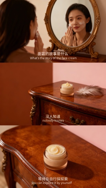 生成三宫格艺术感写真图,场景为复古梳妆台,色调呈焦糖棕与柔粉渐变,台面上有镜子。画面主体为面霜,突出色彩表达与自我风格。最上面一张为近景,面霜置于梳妆台的背影角度,有人物在擦面霜,添加中英字幕“面霜的故事是什么 What's the story of the face cream”;中间一张是中景,面霜旁搭配一片羽毛,侧身摆放,添加中英字幕“没人知道 nobody knows”;下面一张是特写,俯拍面霜细节,质感高级,添加中英字幕“等待你自行探索 you can explore it by yourself”;整体色调复古文艺,三张图合成横向三宫格。
