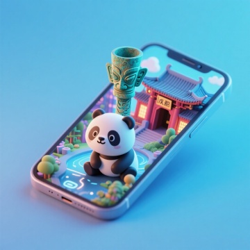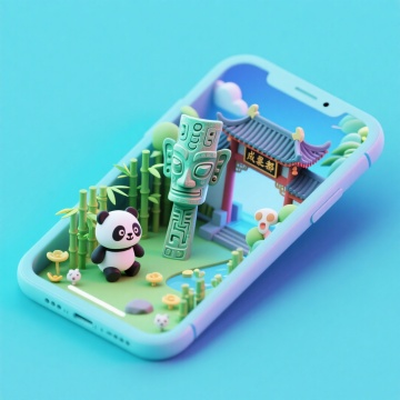 软3D风微缩艺术,可爱熊猫跃出手机屏,融合三星堆与古建筑,清新梦幻的卡通场景,传递传统文化趣味。