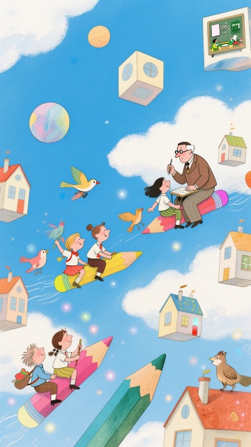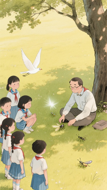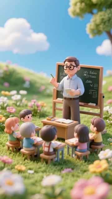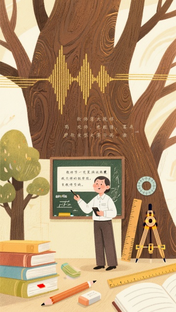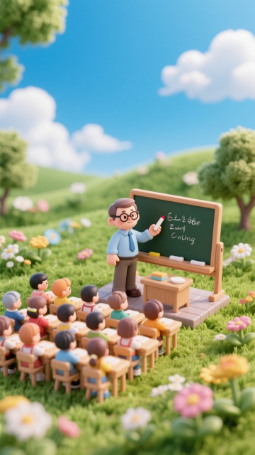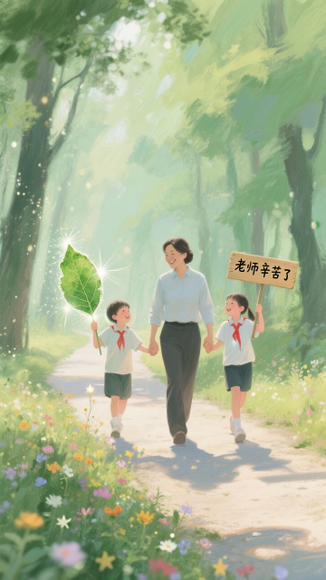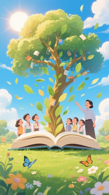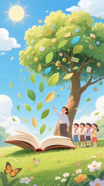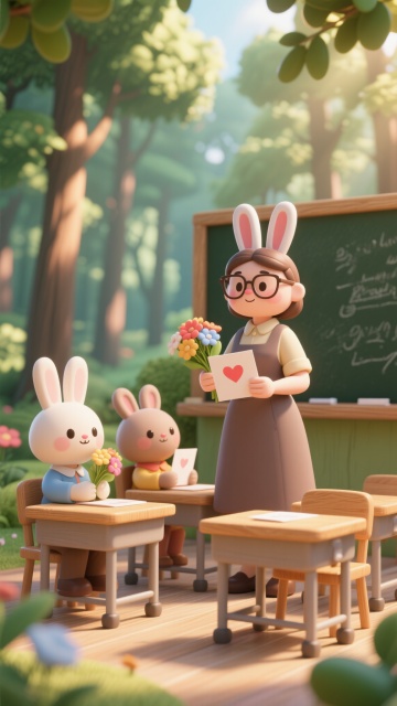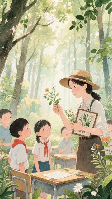 森系童话风格,以绿色和棕色为主色调,茂密的森林里,树洞里是一间小小的教室,教室的屋顶是树叶做的,墙壁是树皮做的。一位穿着树叶裙的精灵老师正给小动物学生们上课,用野果当作教具,背景是森林里的小动物和阳光透过树叶的光斑,营造出森系童话的教学意境。