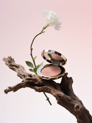 以暖黄为主色调,搭配口红的粉调、瓶身的金棕与花枝的浅黄,营造出温暖、优雅且精致的氛围,尽显美妆品的魅力。