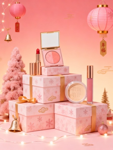 暖黄绸缎、蝴蝶结与柔和光影交融,搭配口红粉调、瓶身金棕,营造出优雅华贵又温暖的氛围,尽显美妆品精致感。