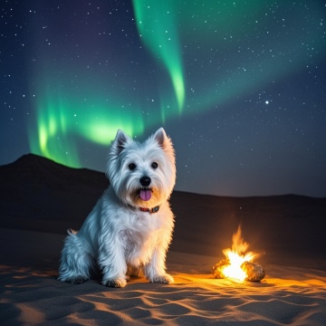 梦幻水彩风,小狗拟人化,身着轻纱,飘浮夜空,满月映衬,超现实童话场景。
